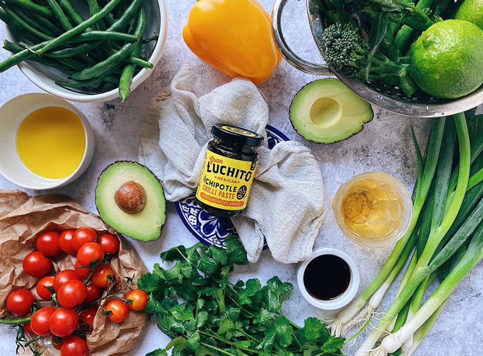 Damit die veganen Fajitas richtig lecker schmecken, benutzen wir Gran Luchito Chipotle-Paste für einen würzigen, rauchigen und gleichzeitig süßen Geschmack sowie Tamari-Sauce, getrockneten Oregano und Limettensaft. Am Ende geben wir noch einen Schluck Lagerbier dazu, um alle Aromen zusammenzubringen. Dann mit Salz und frisch gemahlenem Pfeffer abschmecken.